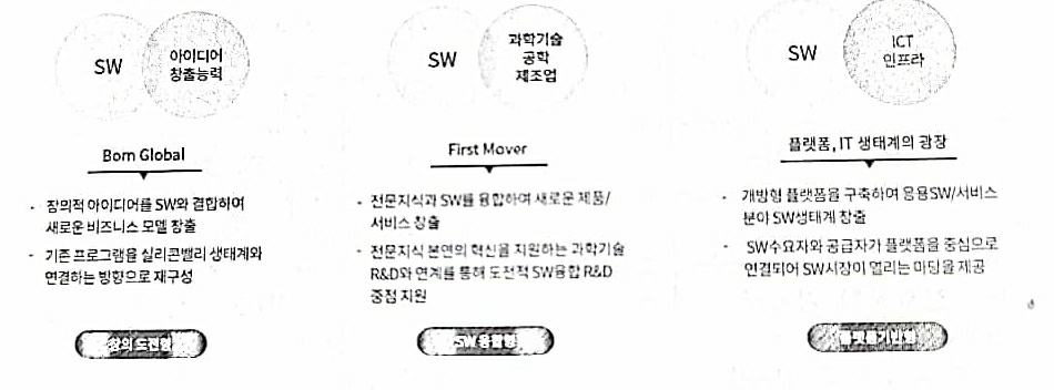 셋째 과제는 SW 기반의 새로운 시장 창출로서 창의 도전형, SW 융합형, 플랫폼 기반형 등으로 구분하고 있습니다.